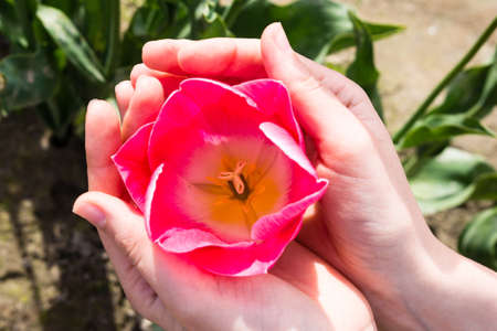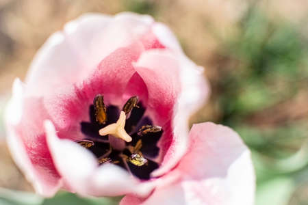 Pink tulip close up. Pistil and stamens. Cute pink tulips, spring pink flowers