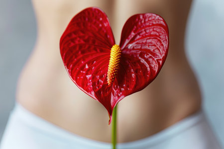Concept of women's health, red flower anthurium on the background of a woman's body, belly and thighs