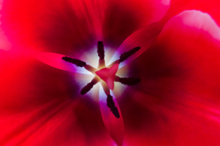 Floral background of a soft focus airy photo of a tulip, photographed from above with shallow focus on the stamen of the flower.