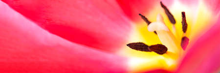 Red pink tulip flower with stamens and pistil close-up, macro photography, floral background