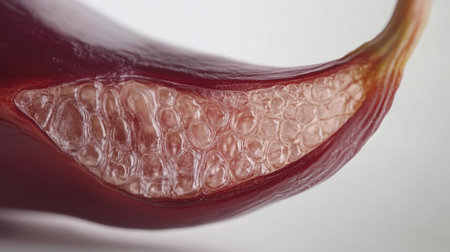 A detailed close-up image of a sliced red chili pepper, highlighting its unique inner structure, seed cavities, and smooth texture, ideal for culinary and health uses.