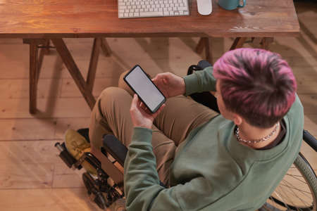 High angle view of disabled woman with short hair sitting on wheelchair and working on her mobile phone