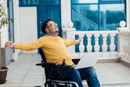 Laptop laying on the knees of disabled person, who sitting in wheelchair