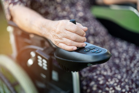 Asian lady woman patient on electric wheelchair with joystick and remote control at nursing hospital ward, healthy strong medical concept