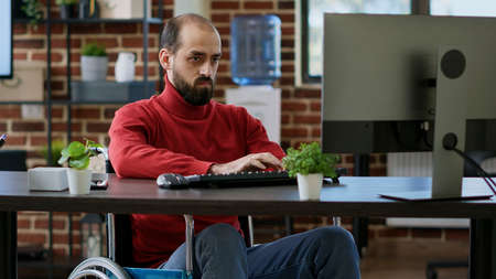 Young entrepreneur using computer to create data charts, working in disability friendly office. Male worker with handicap planning marketing statistics on internet connection, executive job.