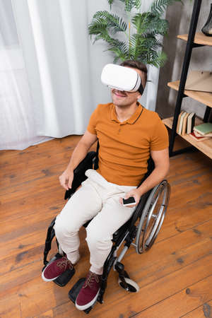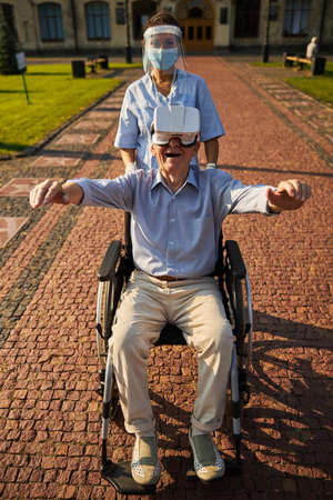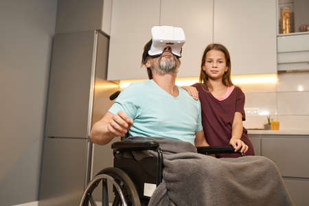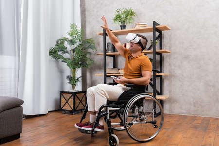 astonished disabled man in vr headset sitting in wheelchair with outstretched hand