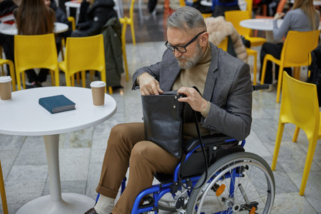 A stylish elderly man in a wheelchair thoughtfully organizes his bag in a busy cafe alone