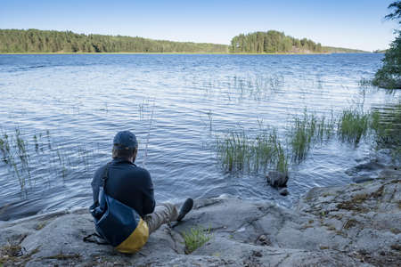 Resting man with a sealed bag sits by the lake on the rocky shore and enjoys the beautiful scenery. Lifestyle.