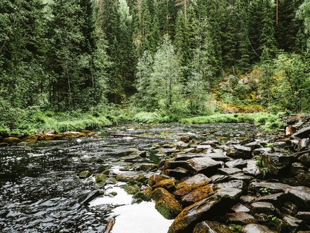 Beautiful landscape with water of calm lake or swamp in autumn or summer evening. Concept of a walk, rest and travel on nature. Nature in Finland or Karelia in Russia