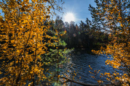 Lake in Karelia among larch trees, Russia. Beautiful autumn season landscape with river and forest stock photo