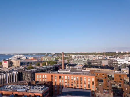 Aerial view towards Hernesaari island, industry area, on a sunny summer morning dawn, in Helsinki, Uusimaa, Finland