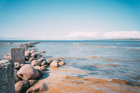 View of ancient cobble stone pier in Ainazi, Latvia. Rocky Ainazi pier in the Baltic Sea dividing Latvia and Estonia