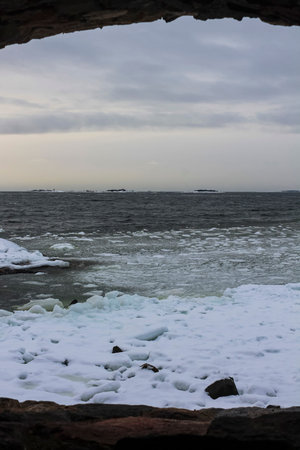 Frozen coastline and ocean in Helsinki, Finland in winter time. Here we were in Kaivopuisto park
