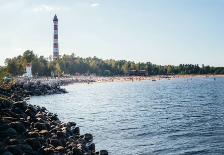 old lighthouse on the rocky shore with a beach on Ladoga, people on the beach on a Sunny day