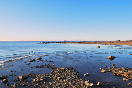 Sandy shore with stones in the bay. Nature landscape.