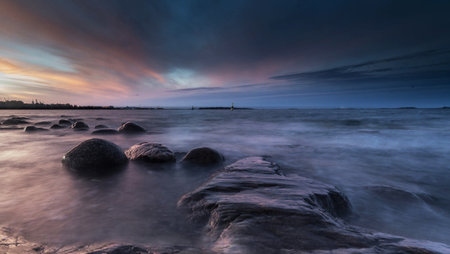 Long exposure of Baltic sea shore with rocks and lighthouse at sunset.