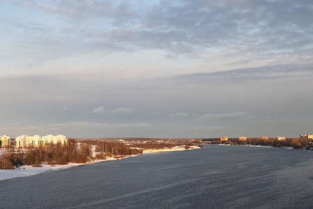 river on a sunny evening. Trees and shrubs. Landscape of winter nature, river banks overgrown with bushes