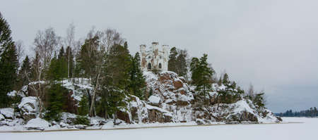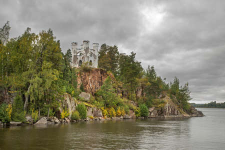 Beautiful landscape with chapel Ludwigsburg on the island Ludwigstein, Monrepos Park, Vyborg, Russia.