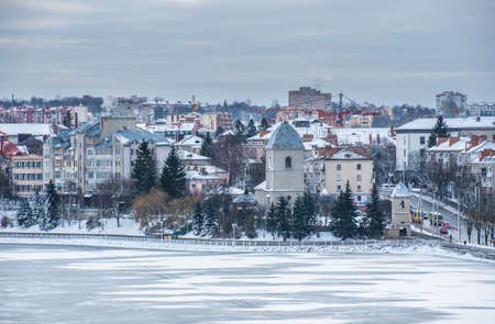 Ternopil, Ukraine 05/01/2020. Panoramic view of Ternopil pond and castle in Ternopol, Ukraine, on a snowy winter morning