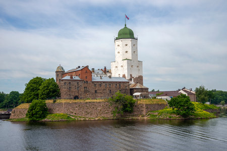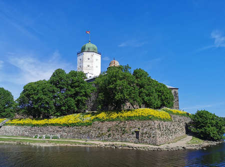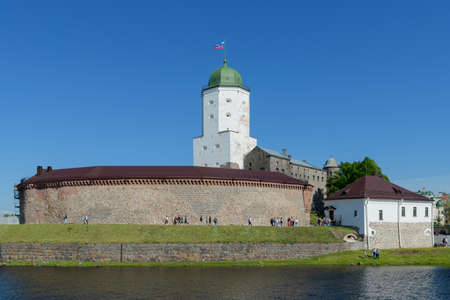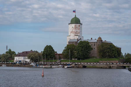 Medieval Vyborg Castle is Swedish-built fortress. White tower of Saint Olav with flag. Historical and architectural landmark.