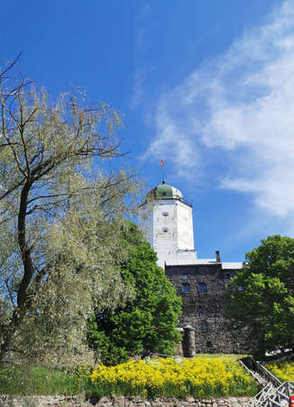 View of Vyborg Castle and St. Olaf's Tower, built in the 13th century, in the city of Vyborg against the blue sky.