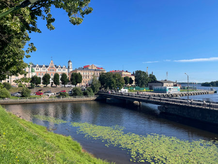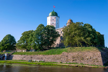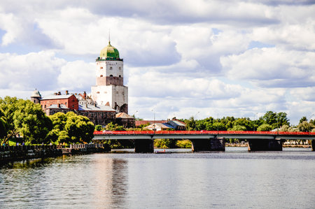 Beautiful view of the Embankment of 30th Guards Corps and the Vyborg Castle in sunlight, Vyborg, Leningrad Oblast, Russia