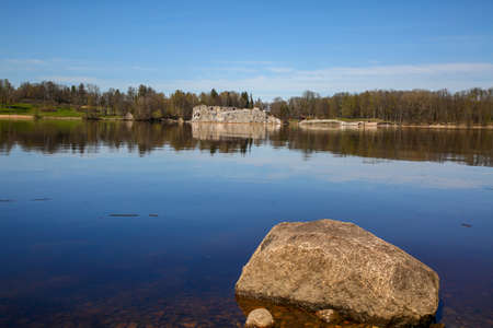 Natural big river Daugava landscape with natural big stones and ruins in Latvia. Koknese castle ruins. Latvian medieval castles. Archaeological monument of national importance.
