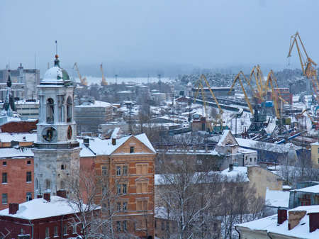 Winter view on snow covered roofs of Vyborg city buildings, Russia