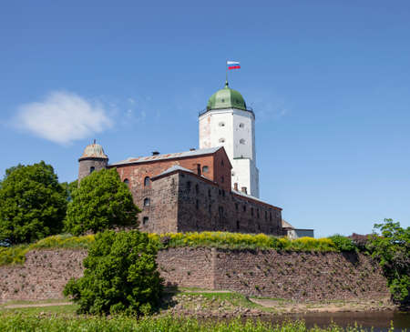 Old Vyborg Castle with the flag of Russia on the tower on clear summer day. Russian tricolor against the blue sky on the tower of the old castle.