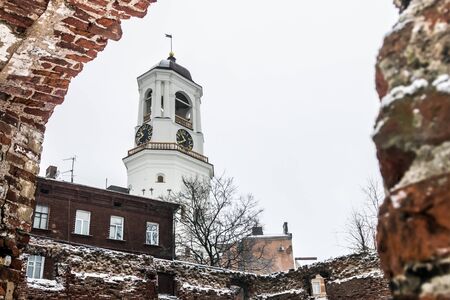 View of the clock tower from the window of the destroyed Church, Vyborg, Russia, winter