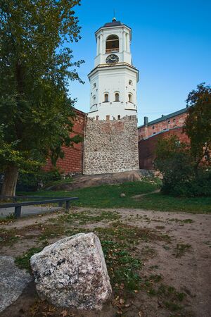 The Bell tower of the cathedral in Vyborg after reconstruction and a memorial stone is a tourist place and a landmark of the old city.