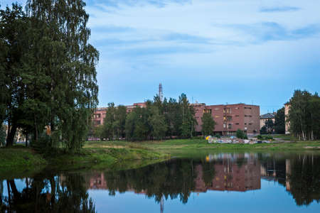 Embankment of the 30th Guards Corps with trees and apartment buildings in overcast day, Vyborg, Leningrad Oblast, Russia