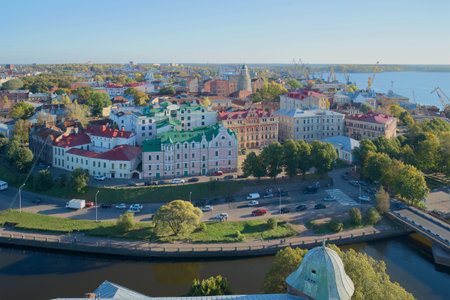VYBORG, RUSSIA - August 16, 2021. Panorama view of Old City with old fashioned buildings from famous Vyborg Castle.