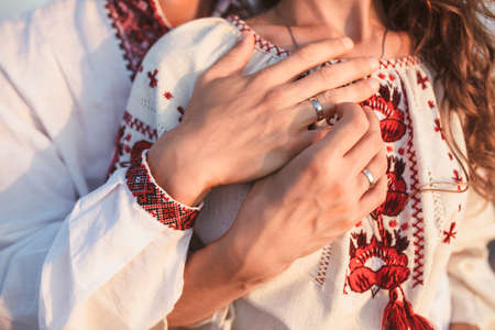 Beautiful couple in national Ukrainian embroidered shirts shirt, in sunset