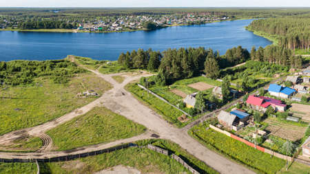 City view on a sunny day. Houses stand on the banks of the river. Countryside.