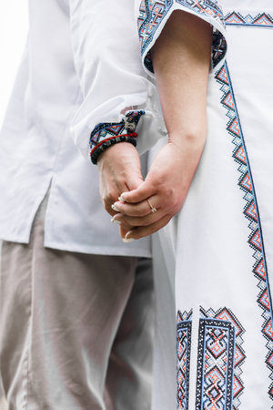 Intimate Connection: A Couple's Hands Clasped Together in Cultural Traditional Attire with Elegant Embroidery.