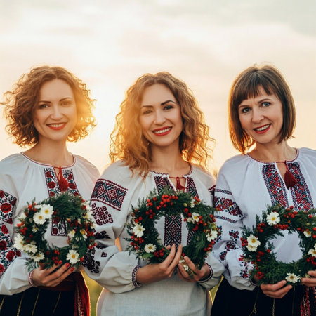 Young Bosnian individuals in traditional embroidered clothing celebrating outdoors under a bright sky, Bosnia and Herzegovina Independence Day.
