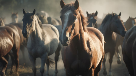 A striking scene captures a herd of horses galloping through a dusty landscape, enveloped in a mysterious fog, showcasing their beauty and power.