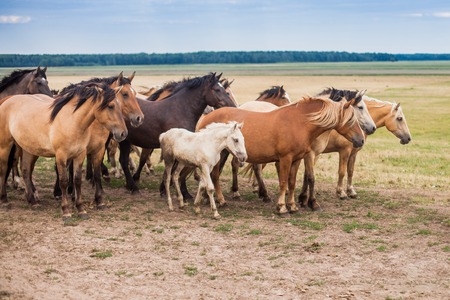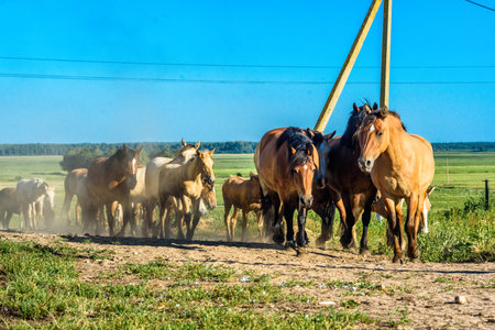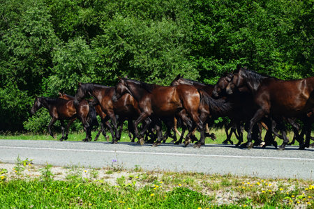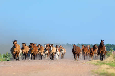 Herd of horses and foals runs on the road