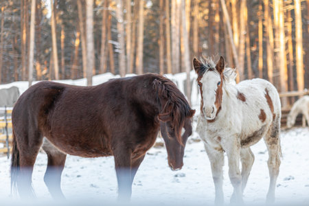 Two horses in a paddock on a farm in winter. Brown and white horse in winter in the animal enclosure.