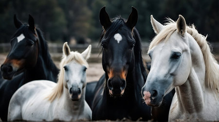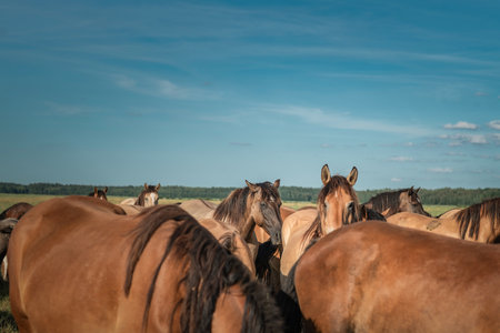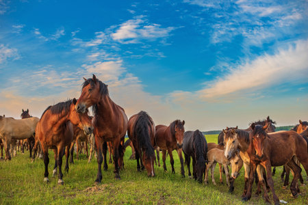 A group of wild horses standing on a beautiful meadow, their manes blowing in the wind as they bask in the sunlight