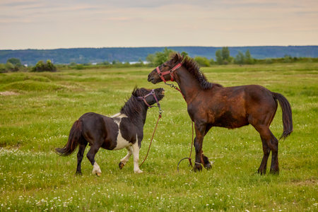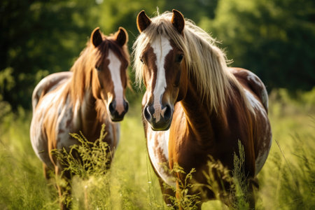 a pair of horses, portrait of animals in summer in a meadow, ecotourism