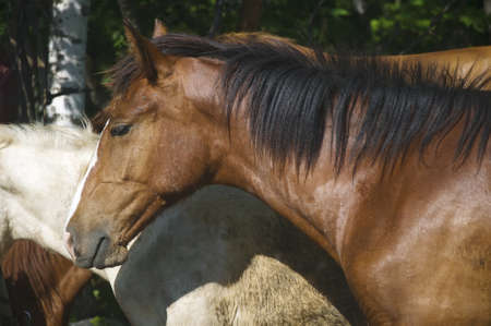 Horses stand close together on the farm in summer. Photographed from a close distance.
