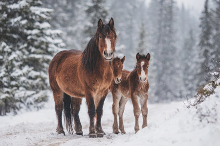 Herd of foals on the snow-covered meadow in a deep winter.