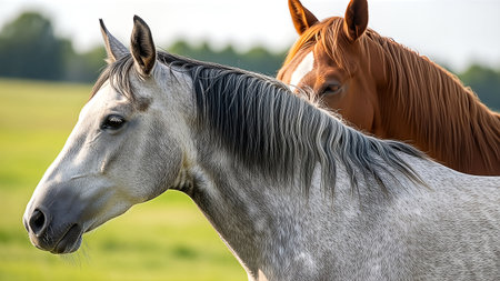 Close-up of a majestic dapple grey horse with a dark mane, sharply focused in a vibrant green field. A blurred chestnut horse with a white blaze stands behind, bathed in soft natural light, creating a serene outdoor portrait.
