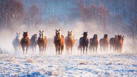 A group of horses is moving gracefully through a snowy field at dawn. The mist adds a serene atmosphere while trees stand silhouetted in the background.