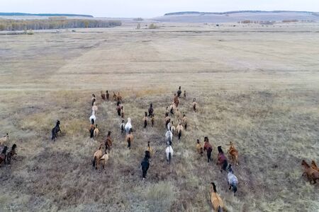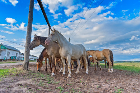 horses walk through the autumn field in the village. A herd of horses is eating grass in the field.