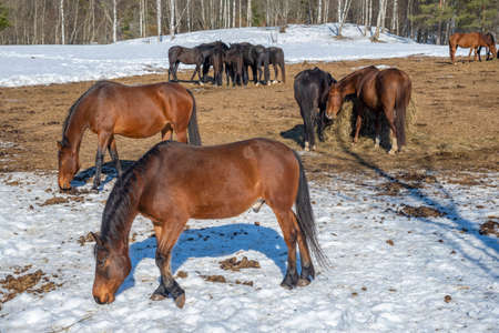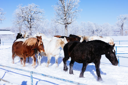 domestic horses walking in the paddock in cold weather in winter