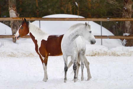 White spotted horse and brown horse portrait, walk on the paddock in winter