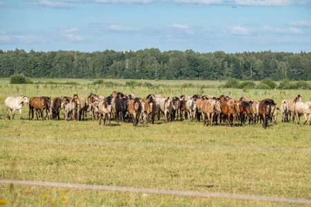 A herd of horses grazes in a paddock in the meadow.